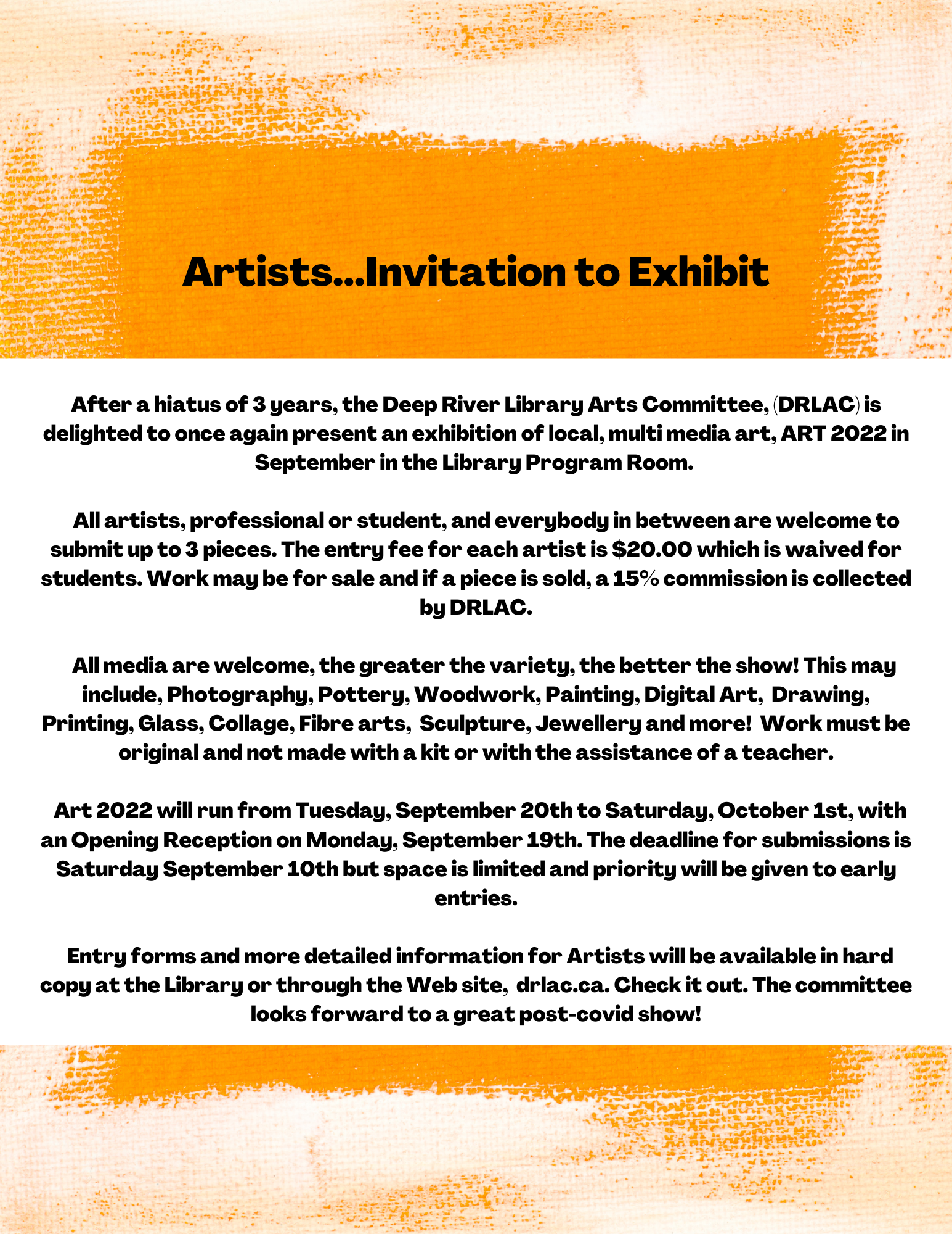 Artists…Invitation to Exhibit After a hiatus of 3 years, the Deep River Library Arts Committee, (DRLAC) is delighted to once again present an exhibition of local, multi media art, ART 2022 in September in the Libra